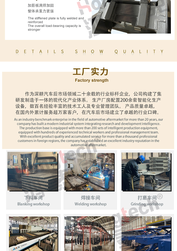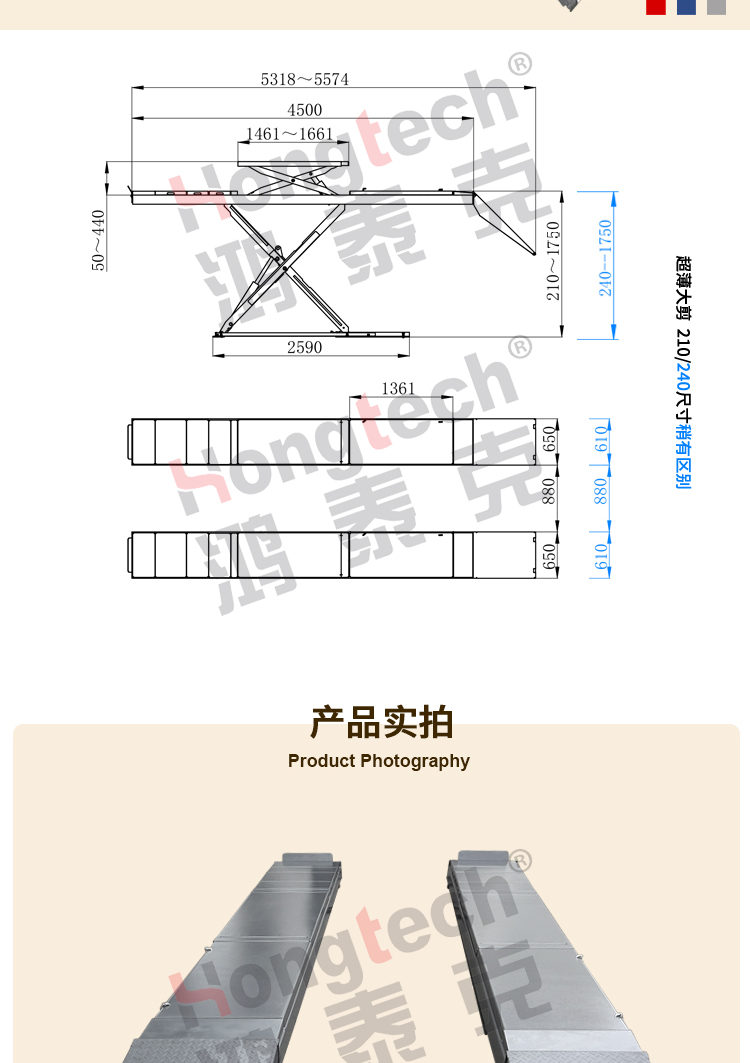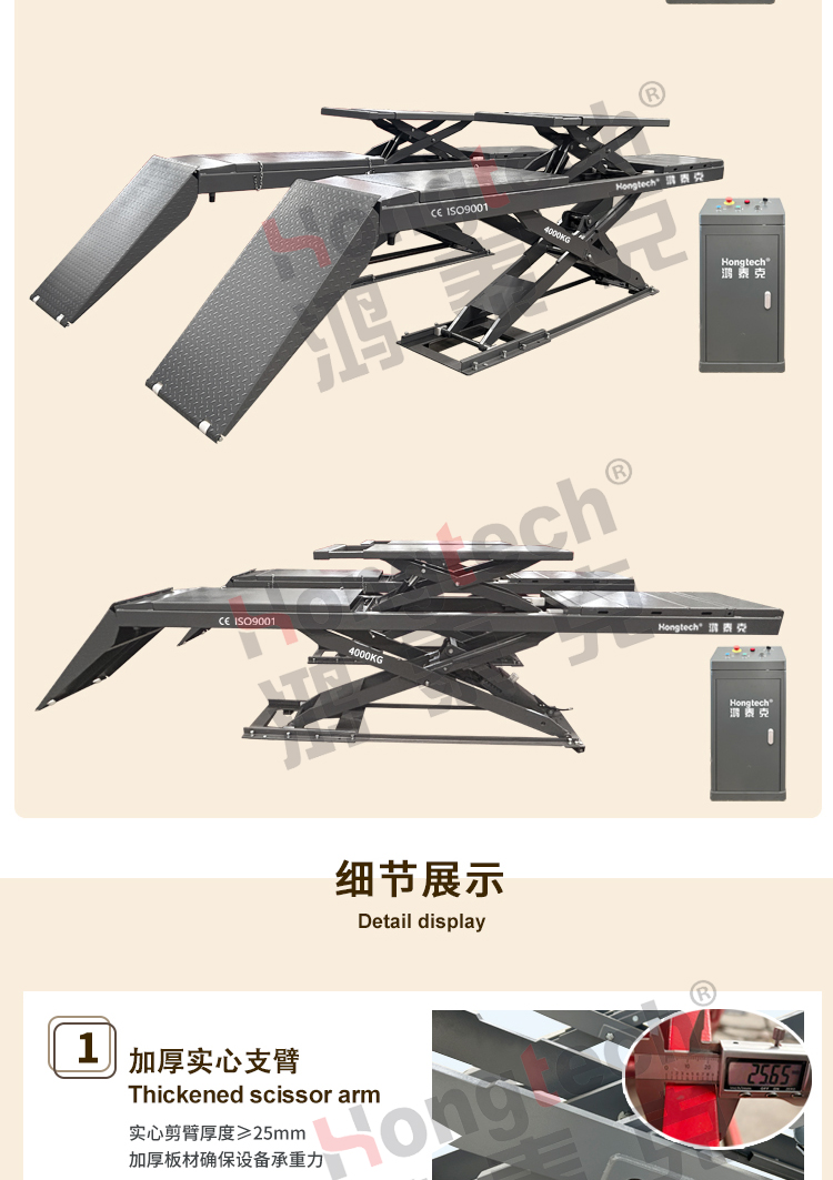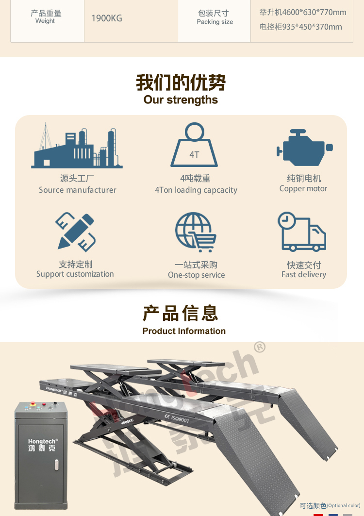产品参数举升重量:4000KG平台长度:4500mm平台子母剪宽度:600mm举升高度:1750mm二次举升:450mm最小落地高度:240mm举升时间:50-60S电机功率:2.2KW电压:220/380V重量/包装举升机 4520*600*590 电控柜 935*450*370 出口包装 &nbs
