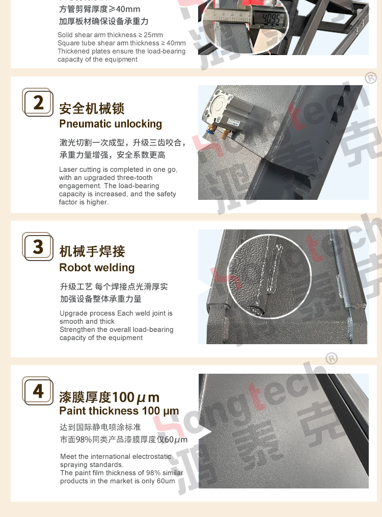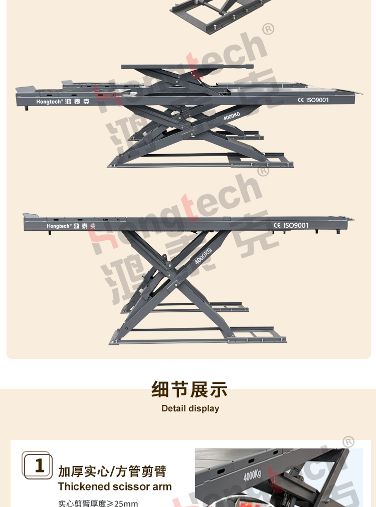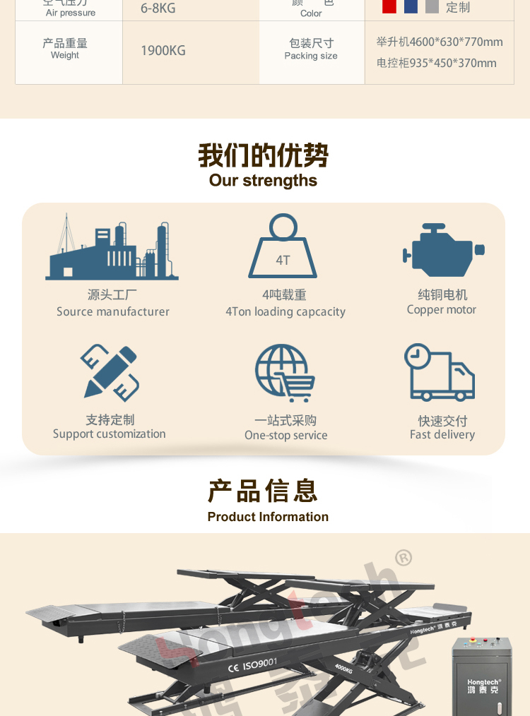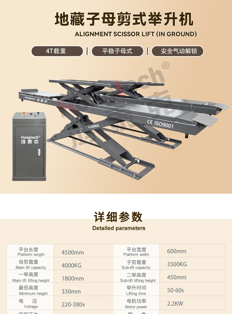 产品参数举升重量:4000KG平台长度:4500mm平台子母剪宽度:600mm举升高度:1750mm二次举升:450mm举升时间:50-60S电机功率:2.2KW电压:220/380V重量/包装举升机 4600*630*770 电控柜 935*450*370 出口包装